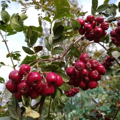 Саженцы рябины Гранатная поражают своим разнообразием и яркостью плодов. Плоды имеют гранёную форму и размером, сопоставимым с вишней. Ярко-бордовая окраска и гладкая текстура делают их настоящим украшением не только сада, но и вашей кухни.